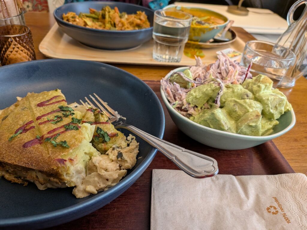 A coffee shop with a few nice vegan options including a vegan sausage roll and a Roast Veg Vegan Burrito. We didn’t get them, but online it lists a coconut almond fudge and blueberry croissant as vegan as well.
